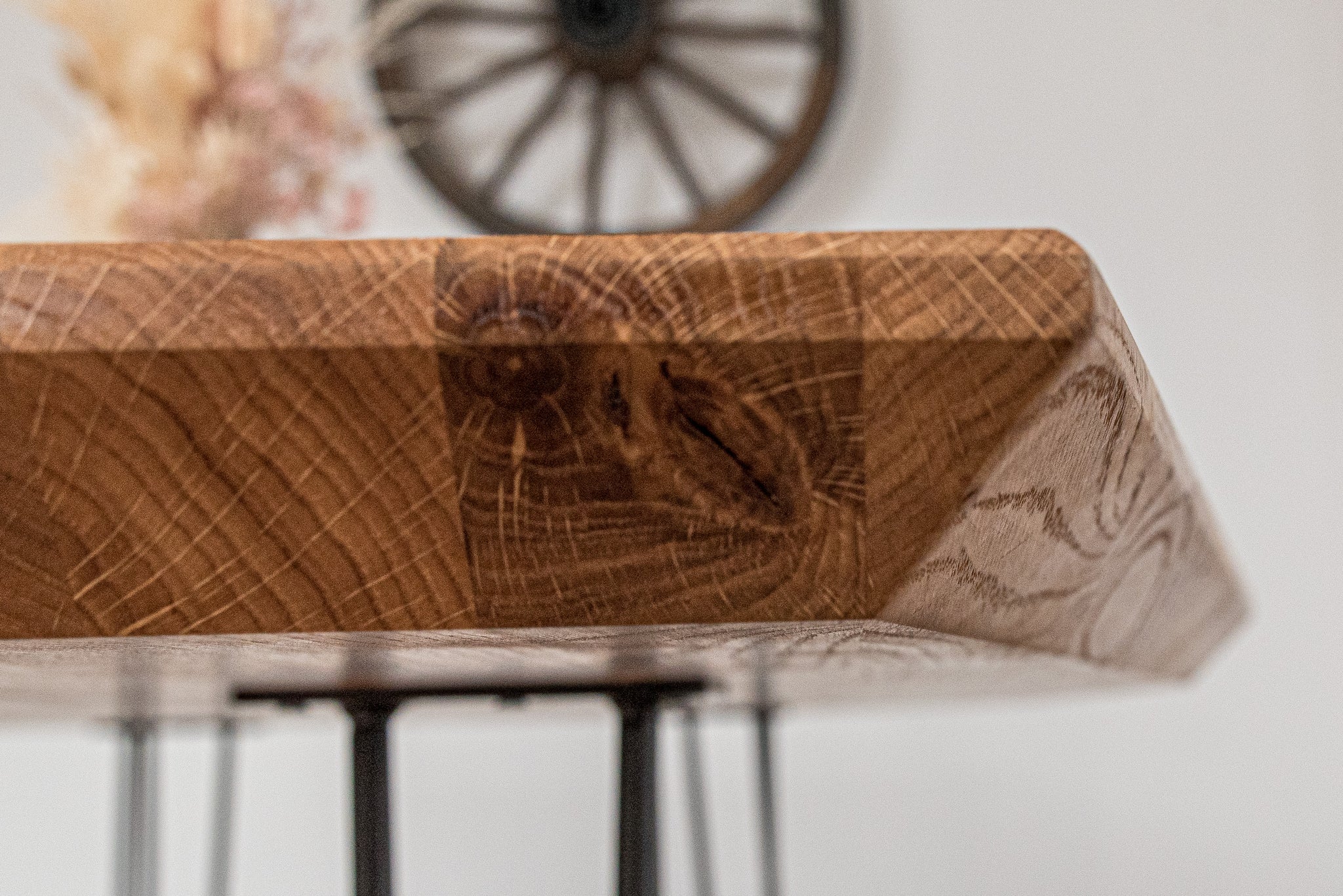 Die Kernige Königin ist ein Oktagon aus Eiche. Sie ist geölt und mit stylischen Haarnadelbeinen untersetzt.